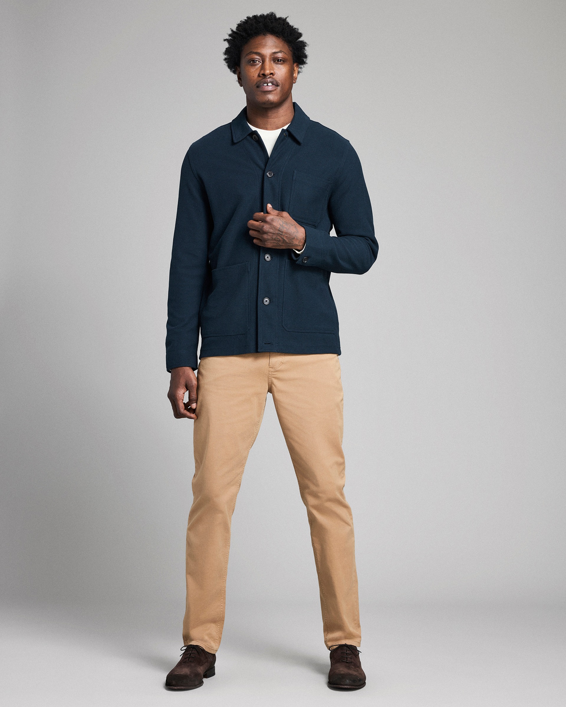 We’re giving the classic chore coat a luxe upgrade, changing out the traditional cotton-canvas for a luxe-feeling, lightweight cotton knit. The result is a piece that feels soft on the skin, flexible to wear over a tee or button-down, and with the pockets and collar of the classic style. It has the same great look of a chore coat, with the feel and warmth of your favorite cardigan. It’s finished with horn buttons down the center placket and our classic heritage ribbon clamshell at the back.