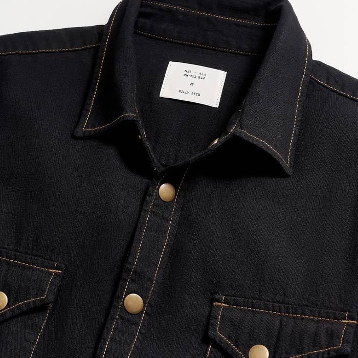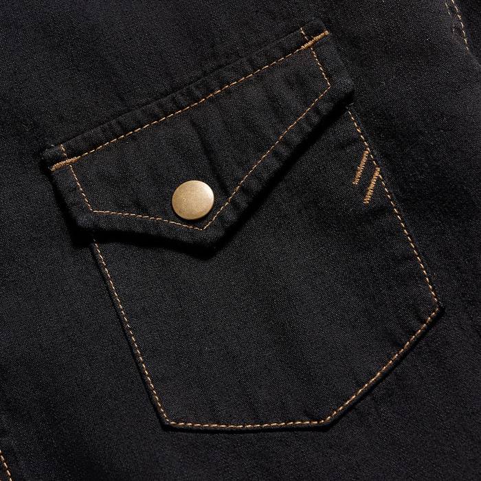 Double spade-shaped chest pockets secured with antique brass snaps.