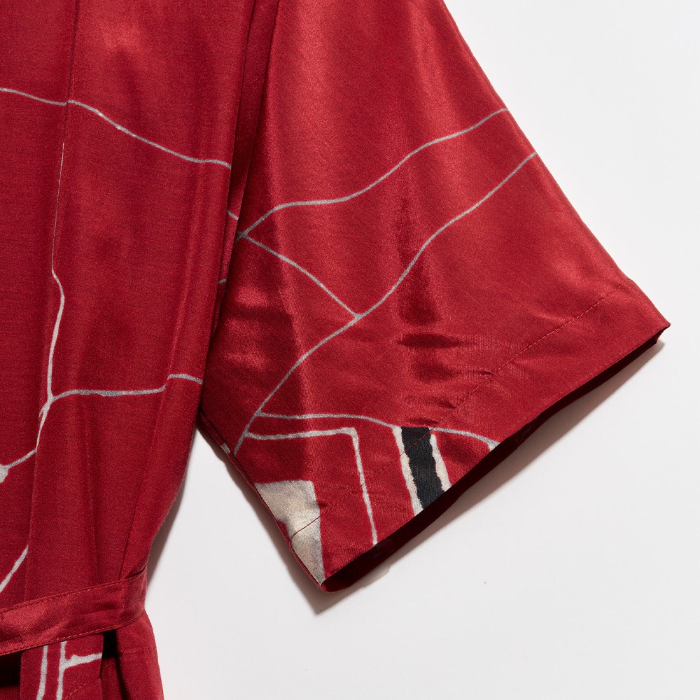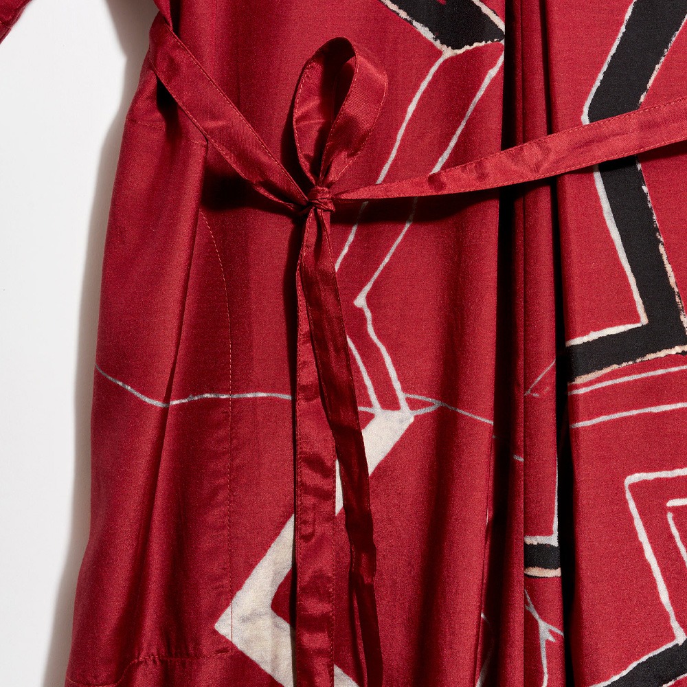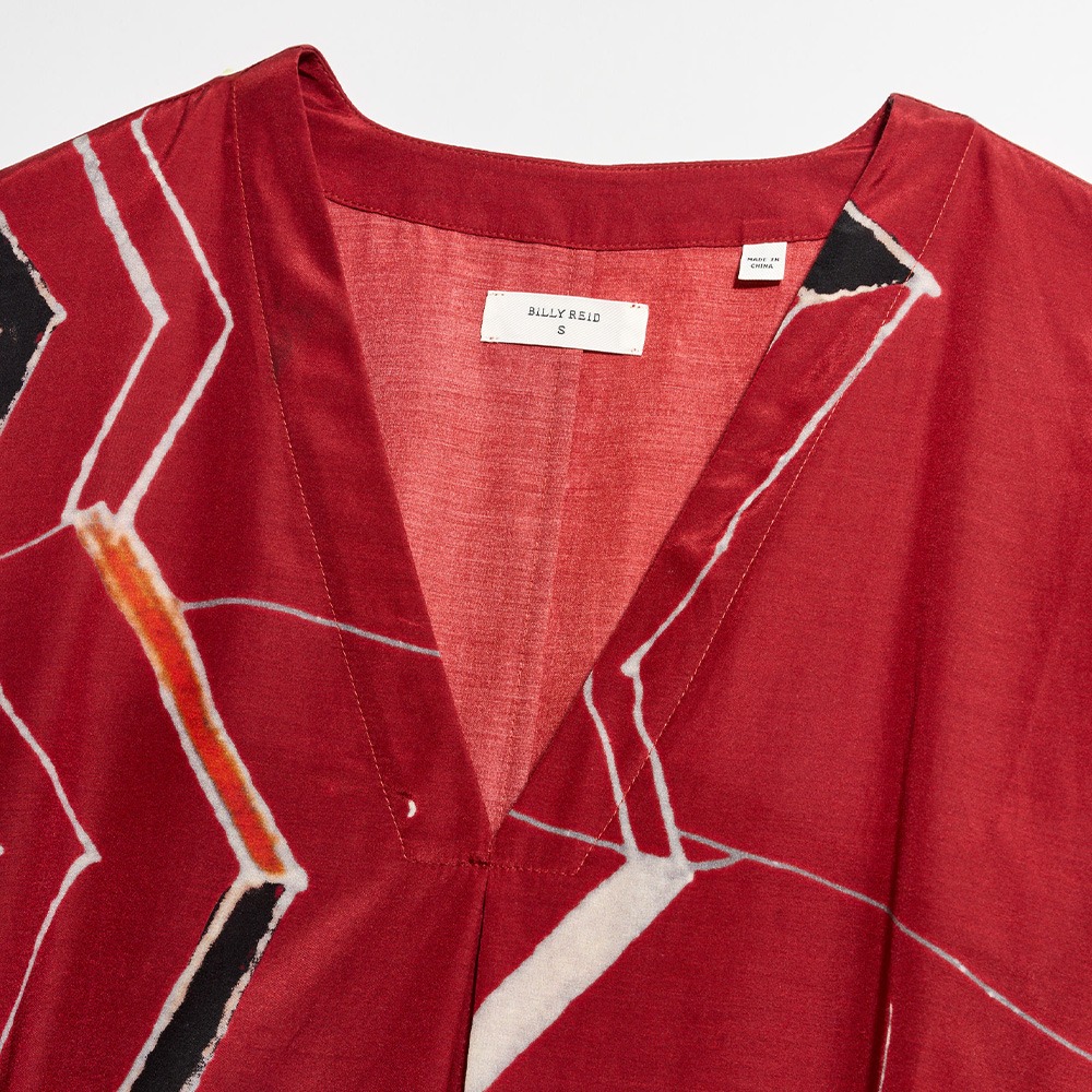 The printed, v-pleat cotton-silk dress has dolman elbow-length sleeves and a deep pleat from the neck line. The dress has been reimagined from our best selling v-pleat blouse in the same signature style, and features an archival custom Mountain print, re-imagined in the season's maroon.