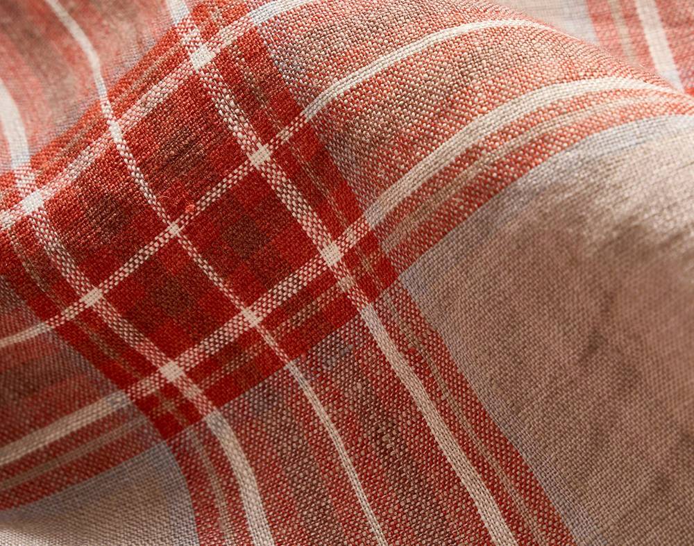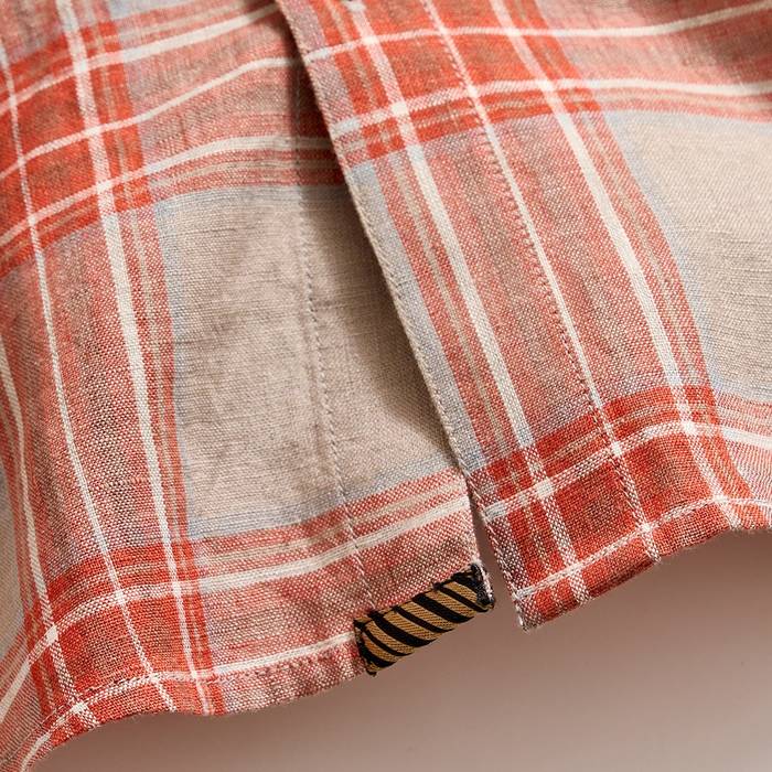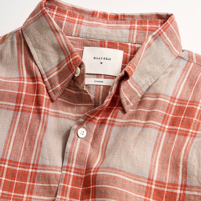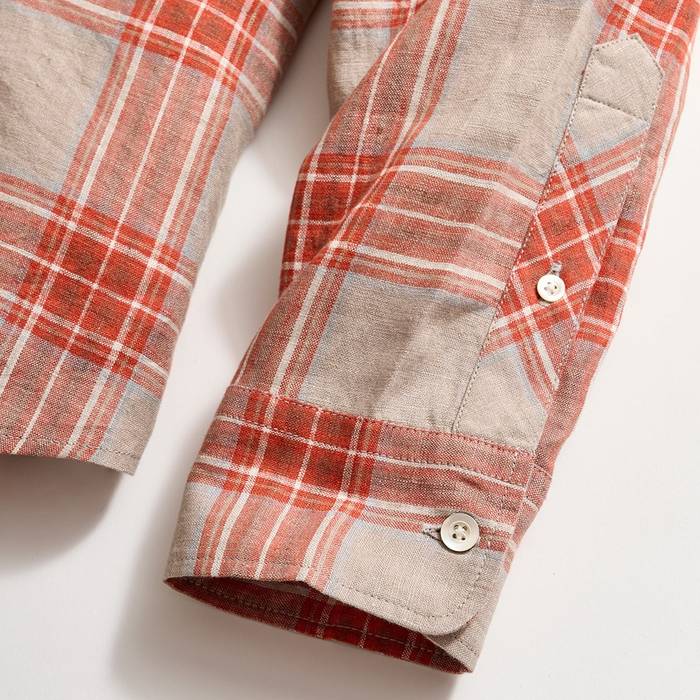 This classic shirt silhouette is one that we’re bringing back in new fabrics and colorways. This version features a bold, brick-colored plaid pattern that looks great worn on its own, open over a tee, or layered under a sport coat. The lightweight Naples linen fabric is perfect for the warm days ahead and breathes easy under the sun. We’ve also finished the shirt with mother of pearl buttons.