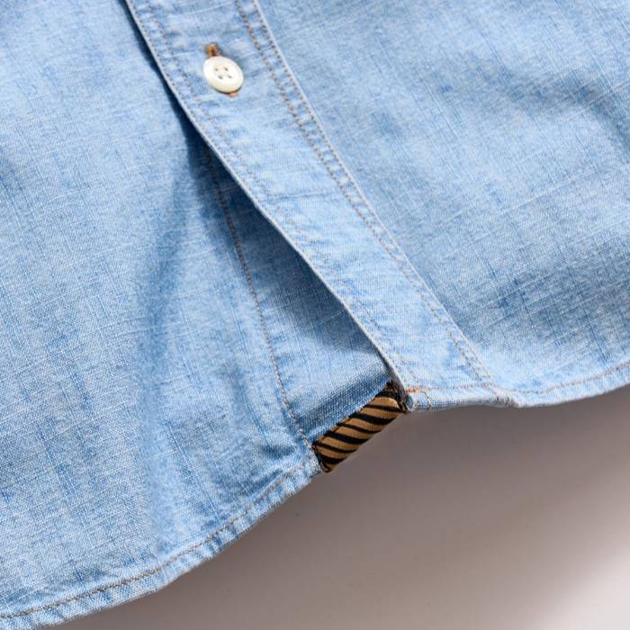 This shirt is constructed from a bleached chambray in a 1x1 weave.