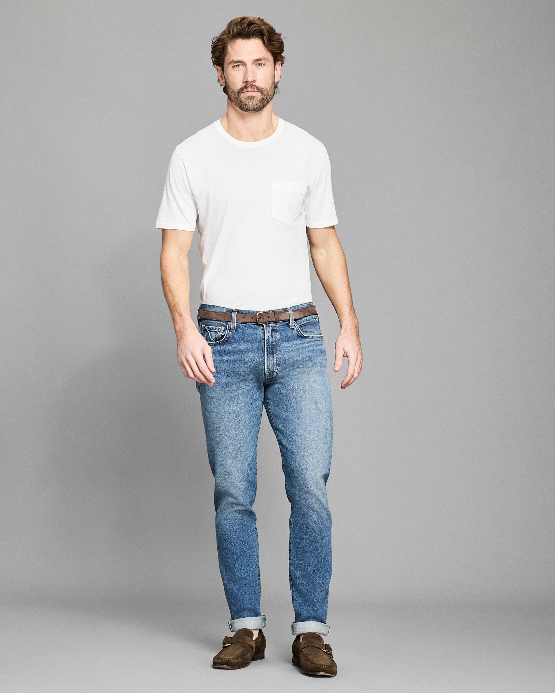 The Citizens of Humanity x Billy Reid collaboration brings you Citizen of Humanity's bestselling Adler fit in three exclusive-to-Billy Reid washes. Made in the USA, the Adler Slim Straight fit offers a slightly higher rise and fits full through the waist and thigh with a small taper from the knee down. This exclusive wash is a medium vintage indigo with noticeable fading and whiskering, providing an everyday and casual ease. It's a lightweight comfort stretch denim, perfect for all-day wearability. Finished with thoughtful Billy Reid touches, like leather washers and a beautiful leather patch embossed with our signature heirloom ribbon stripe.