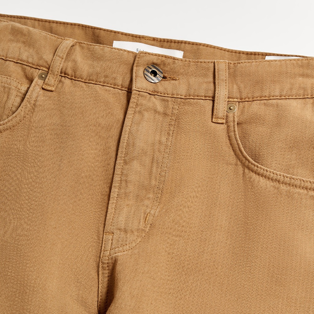 The pant is constructed with antique brass buttons, rivets, and zipper.