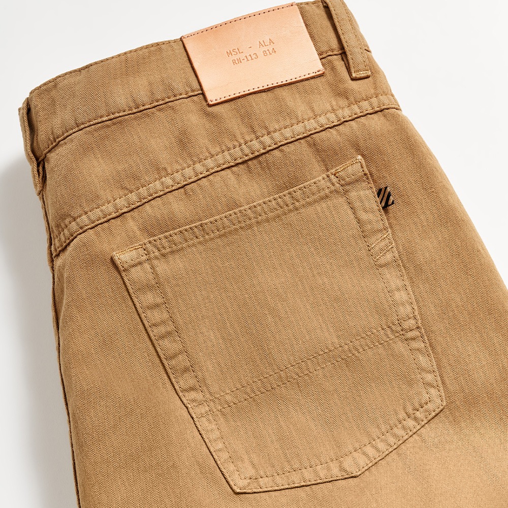 As comfortable as your favorite pair of jeans, these pants are made in a breathable cotton-linen blend with just a hint of stretch for ease of movement and garment-dyed for a lived-in look and feel. Finished with subtle details like an antique brass tack button embossed with our heirloom ribbon stripe and our signature MSL leather patch.