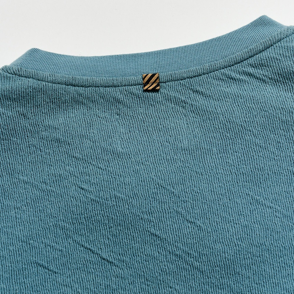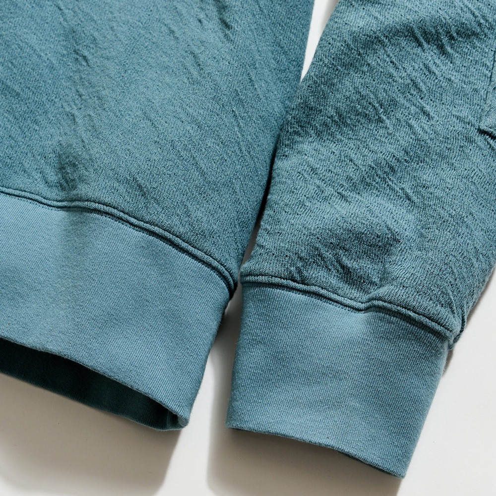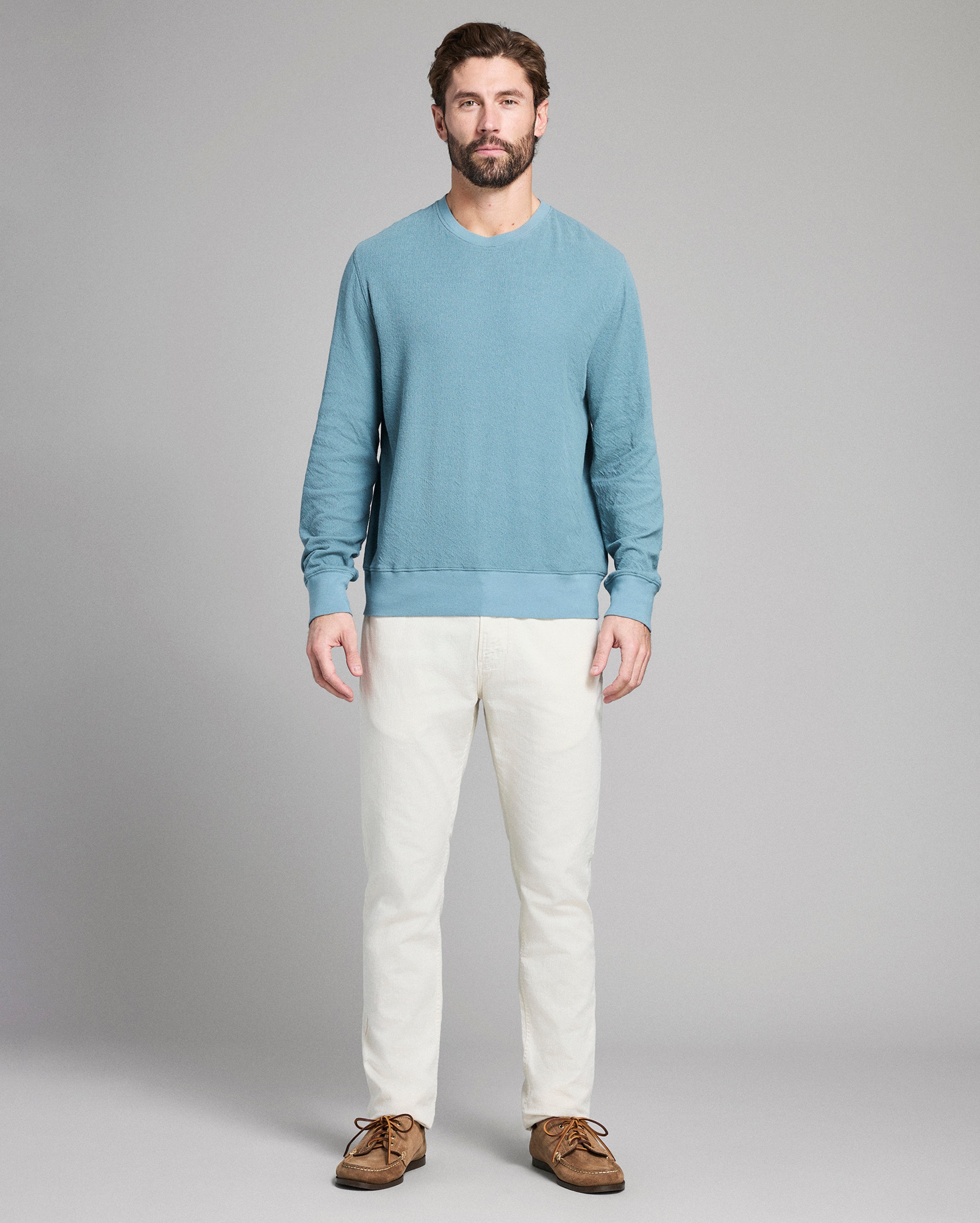 So lightweight and rich in texture, our Crinkle Knit crew is made of 100% cotton and features self-fabric elbow patches. It's finished with thoughtful Billy Reid design details, like our signature heirloom ribbon stripe clamshell and twill tape at the back neck. It's a versatile transition piece that can effortlessly be worn alone or layered underneath a sweater or jacket.