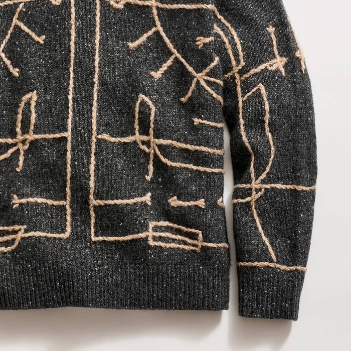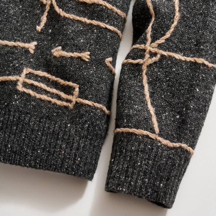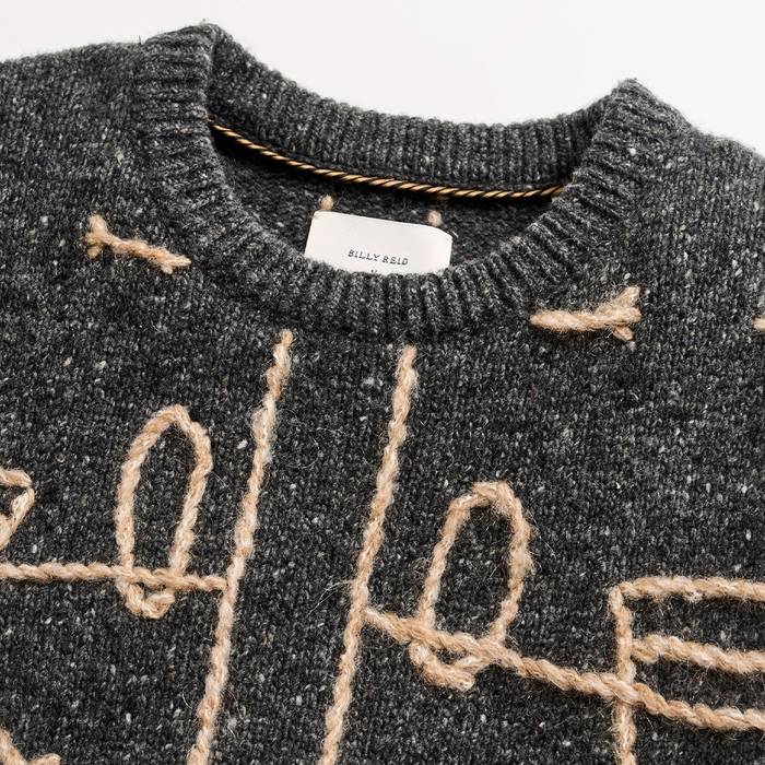 An update to a much-loved archival piece, this unique sweater features a custom pattern based on the mantle at Billy's house, in a textured blend of donegal wool, alpaca and mohair, with an excellent hand feel. Luxurious details include a hand embroidered whip stitch throughout, and our signature ribbon stripe knit into the back neck.