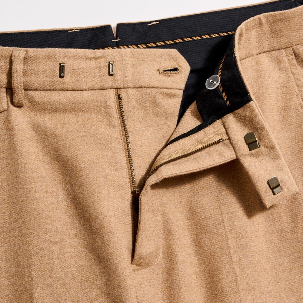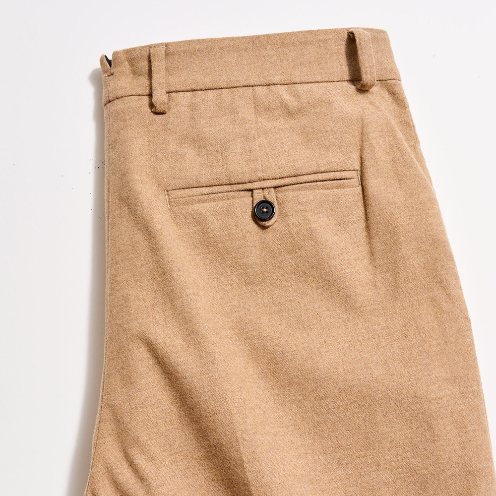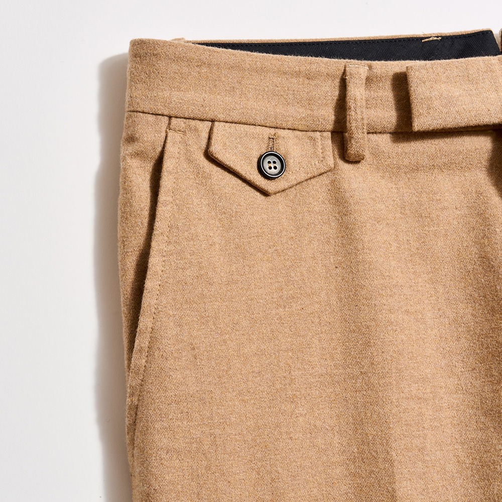 Our Flat Front Trouser is a slim-fit trouser woven from a cotton flannel blend in a rich, custom tan heather. It features two front slash pockets, one waistband watch pocket with a button flap, two rear welt pockets with button tabs, belt loops on the waistband, and our heirloom ribbon stripe detailing on the interior waistband for a subtle signature detail.