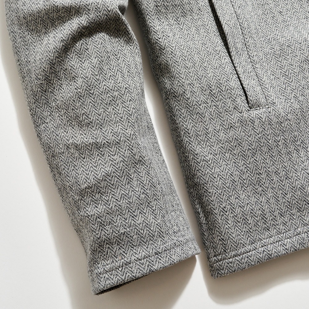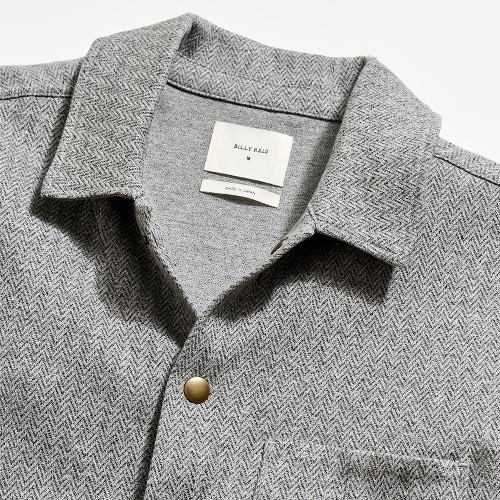 We’ve paired the relaxed fit of a shirt jacket with the intricate luxury of vintage Japanese knitting techniques to create an elevated layer you’ll love for years to come. Crafted in Japan in collaboration with our friends at Numajiri, this cotton-blend piece features a marled grey herringbone fabrication, antique brass snaps, and our signature heirloom ribbon clamshell at the back neck. It boasts an enveloping softness that you’ll reach for again and again.