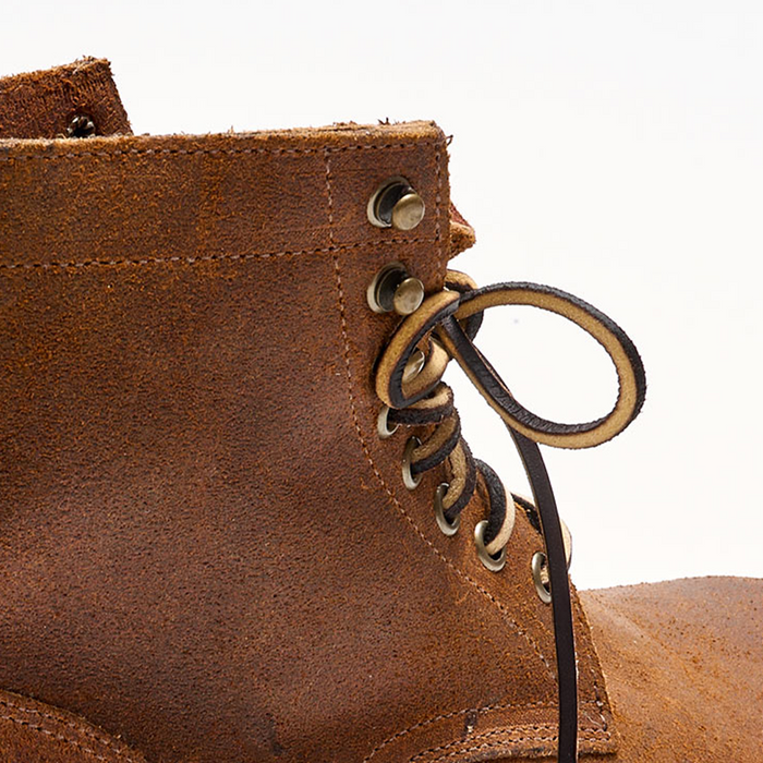 Based on the WWI US Army M1917 Boot. True Goodyear Welt construction, hand-lasted with Barbour® Storm Welt. Calfskin vamp lining with a partially-structured toe. Antique brass eyelets and speedhooks with Cougar #50 rawhide laces. Leather pulls lined with Billy Reid's signature grosgrain ribbon. Fully recraftable. Handcrafted in the USA.