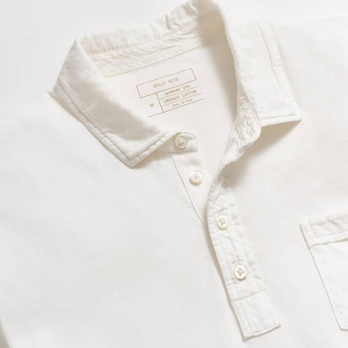 First shown in our Spring 2002 runway show, the Pensacola Polo has become a fan-favorite and beloved mainstay in our collection. It seems simple, but there’s more to it than meets the eye, and if you blink - you’ll miss what separates it from the pack. It’s cut in butter-soft organic cotton and then garment-dyed for a lived-in look and feel. The fit is classic and boasts straight sleeves without banding for an elevated look. The collar and placket work hard and maintain their structure (no more floppy collar) thanks to woven cotton sheeting. The under-placket is also finished with twill tape for a refined touch when worn unbuttoned. The chest pocket is simple yet sturdy and features diagonal stitching, reminiscent of our signature heirloom ribbon stripe and the stripe itself shows up inside the vents at the wearer’s waist for a subtle Billy Reid detail. The Pensacola Polo handsomely epitomizes effortless yet elevated.