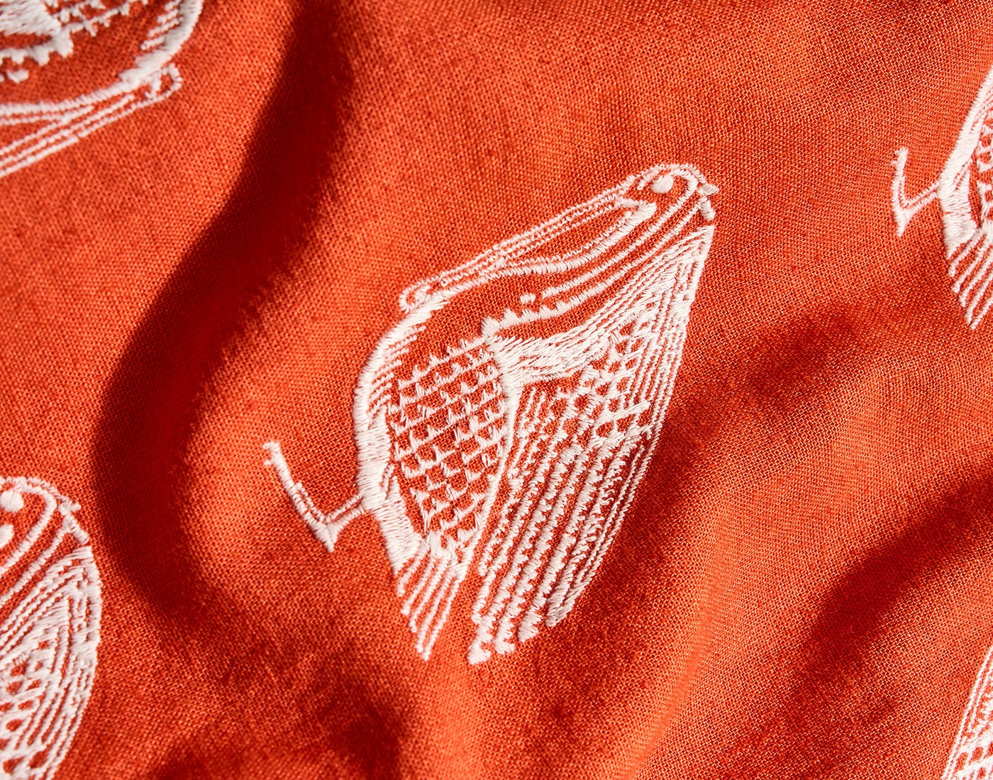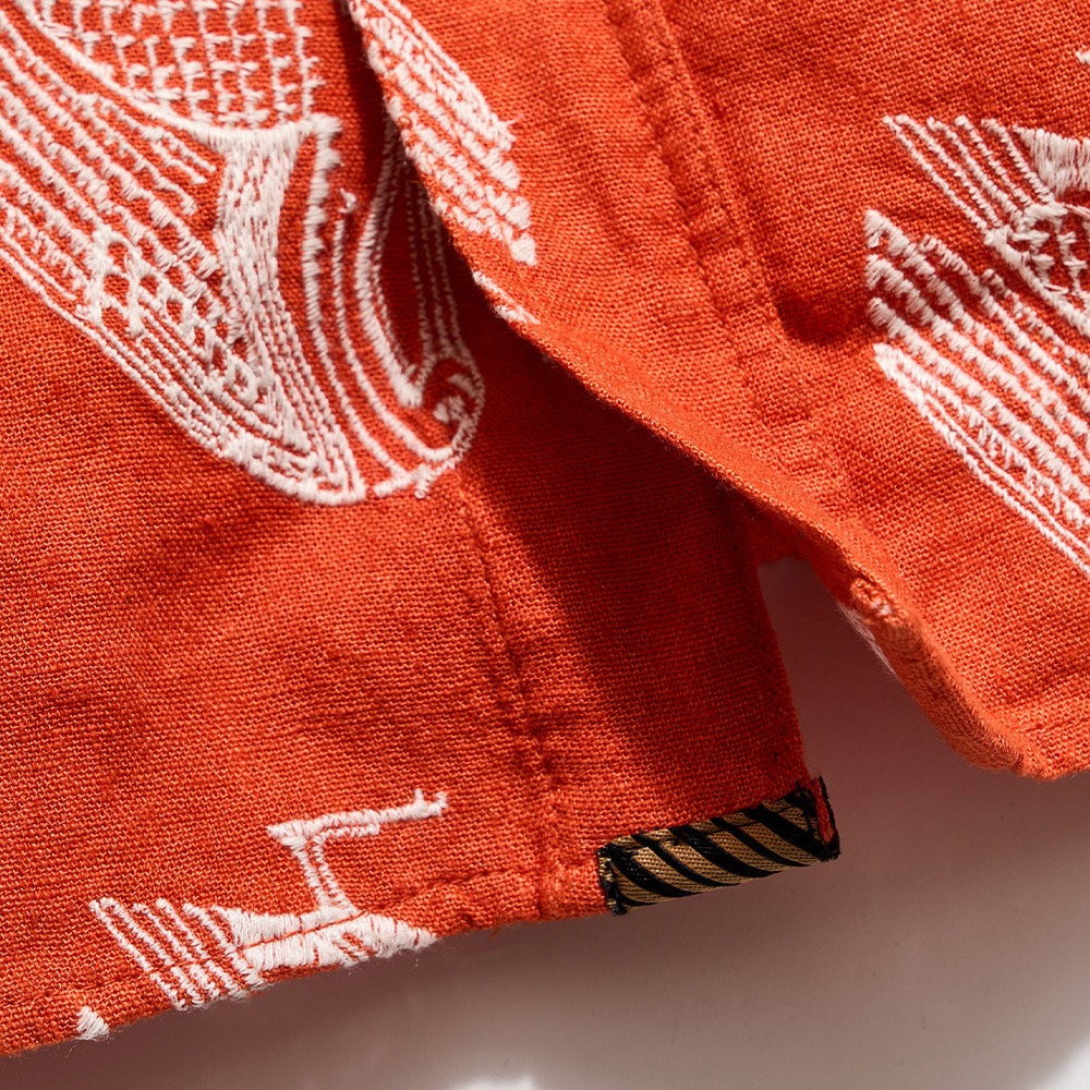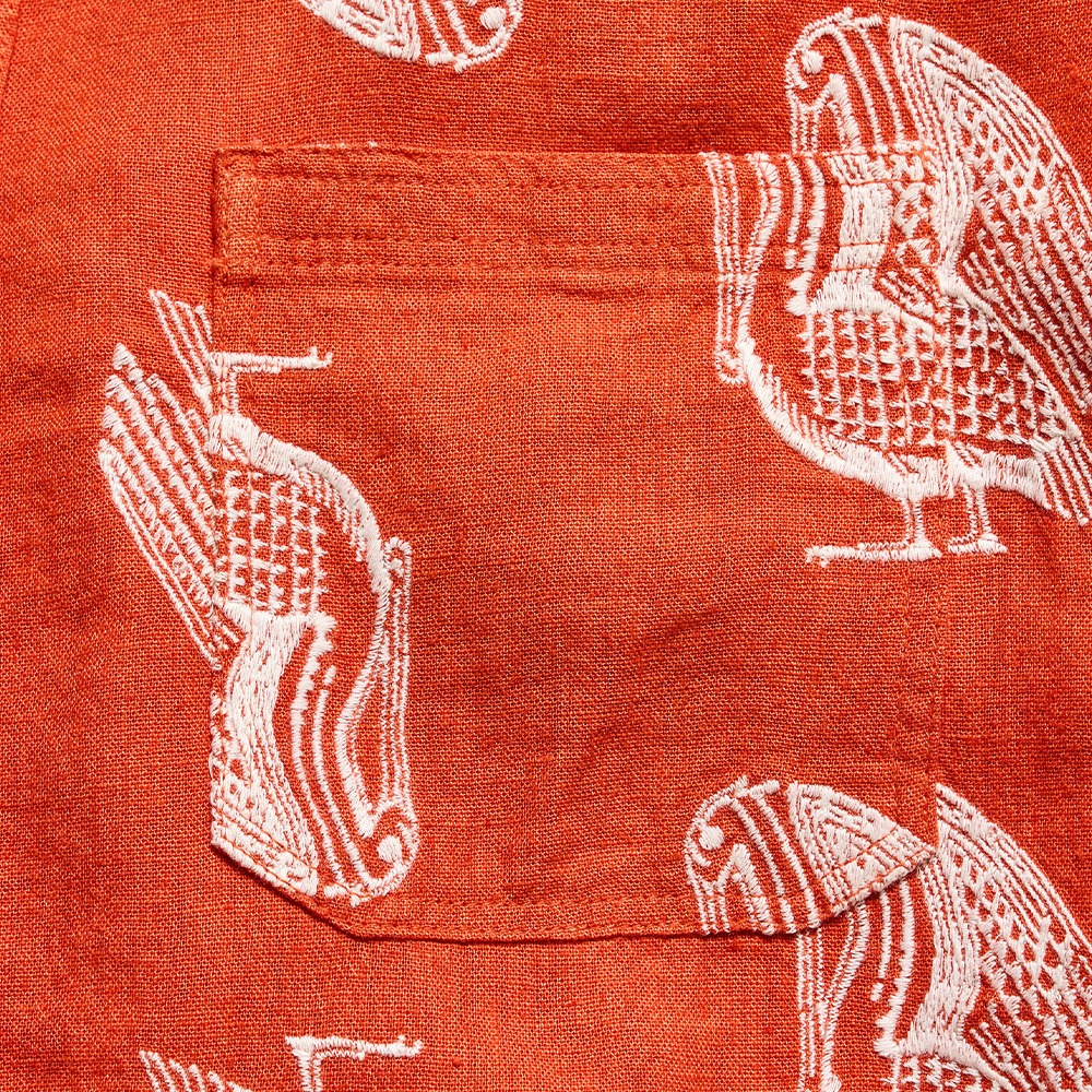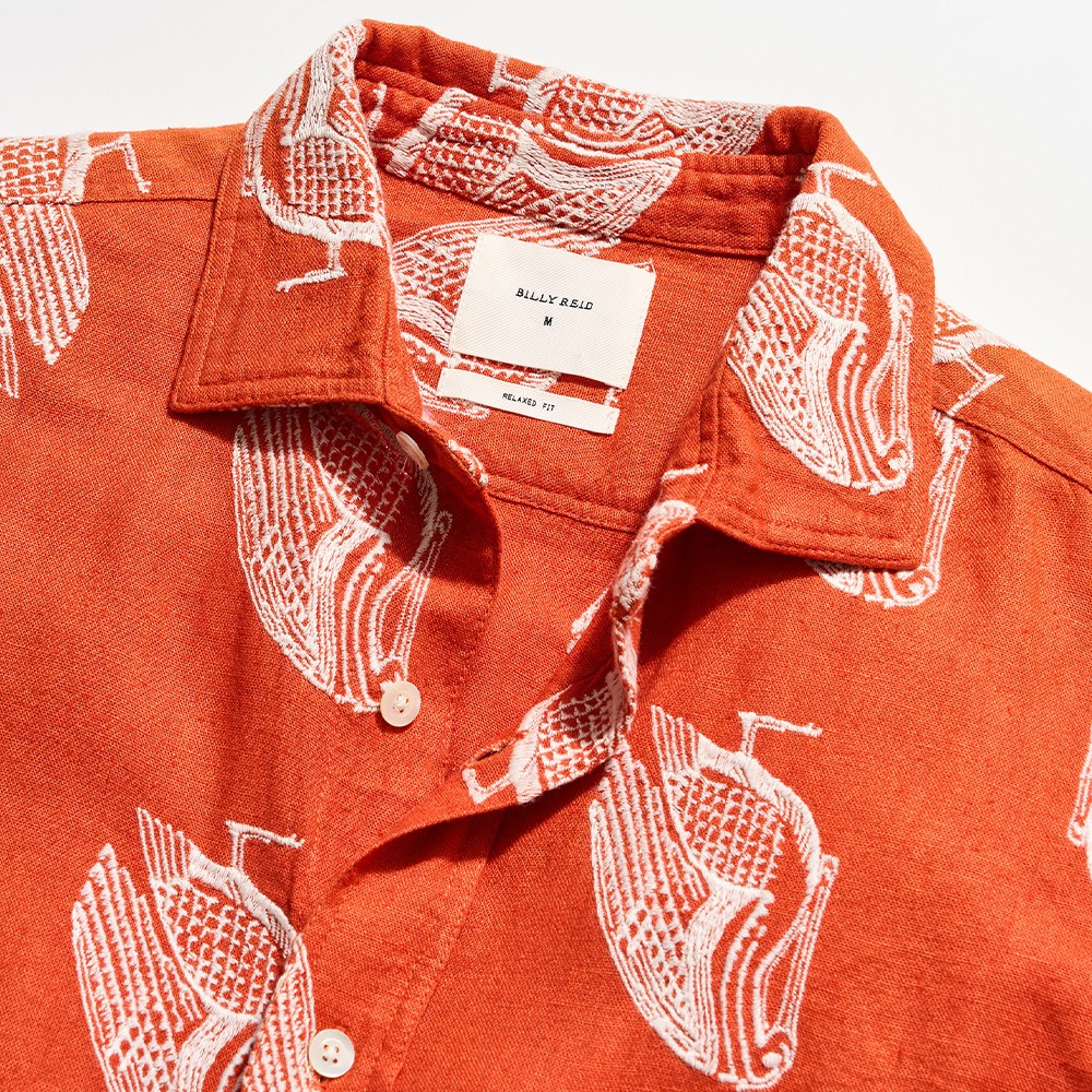 Pelicans are a running motif here at Billy Reid; they grace everything from the walls of our shops to the liners of our jackets. Now, one of our mascots gets to spread its wings on a linen-blend shirt. The bird is embroidered at a large scale to add lots of interesting texture that looks great on its own or layered under a sport coat. All finished with mother-of-pearl buttons, a notch pocket, and our signature heirloom ribbon stripe on the bottom underplacket.