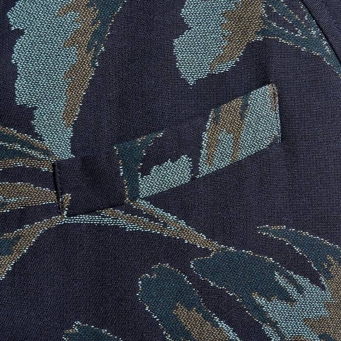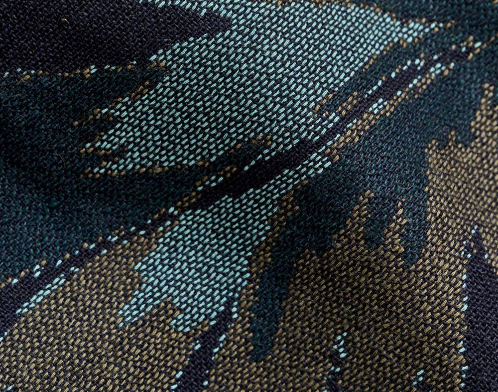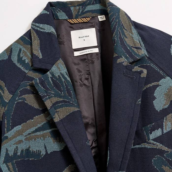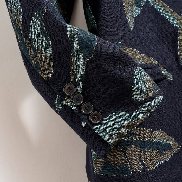 This custom jacquard coat has a relaxed, oversized design that can be worn either with a more formal approach or over casualwear as a way to elevate a tee and jeans combo. The navy and green pattern makes for a comfortable spring coat that fits over any style as a last layer to complete your look.