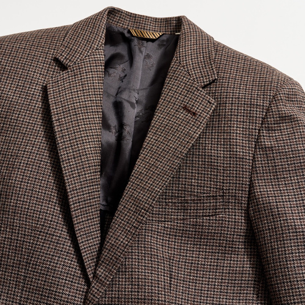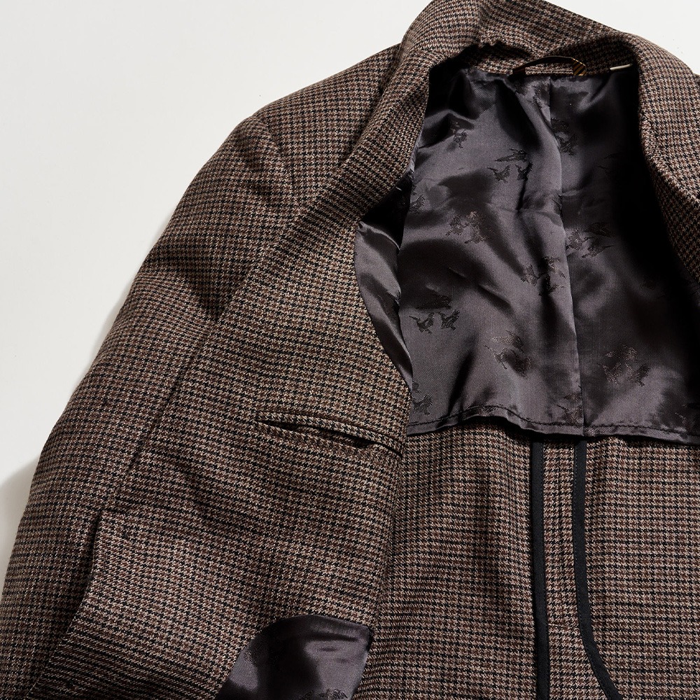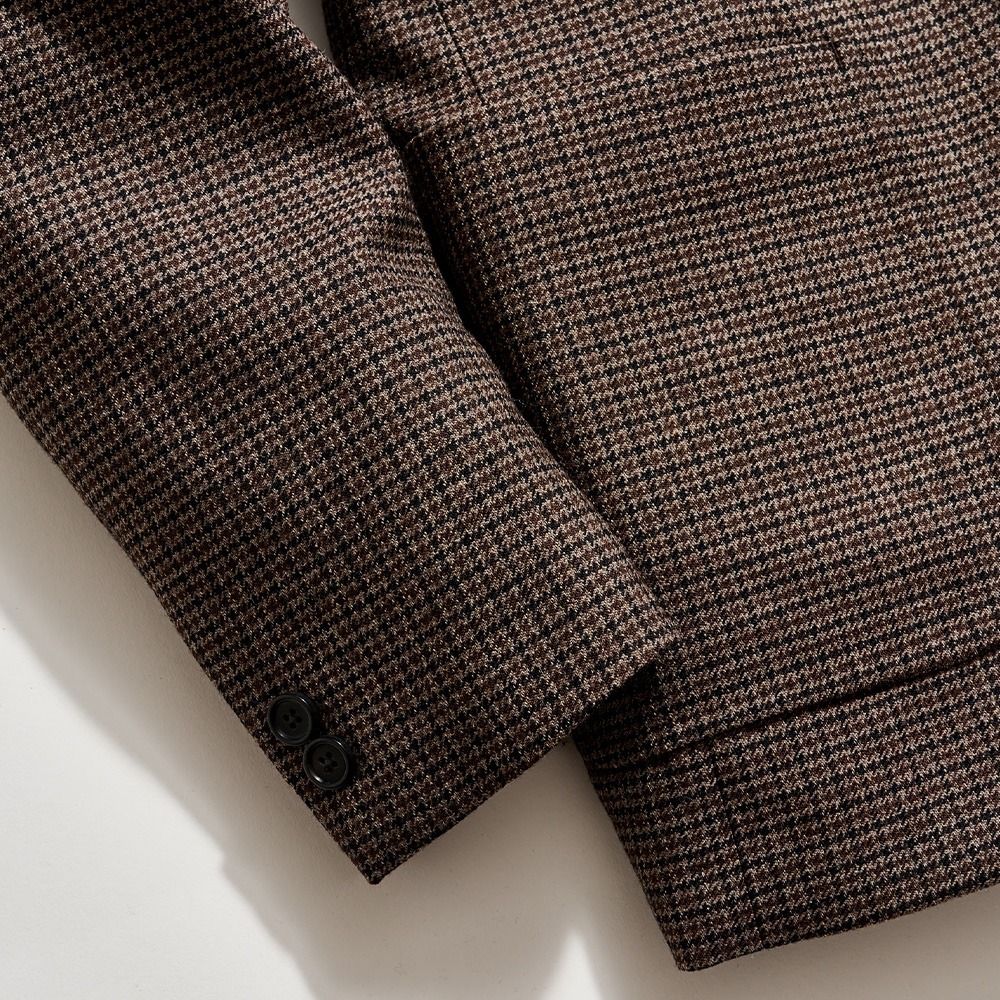 A longtime favorite returns: our Walton Jacket is a modern yet slightly more structured option than our iconic Archie Jacket. Made in Italy, it comes in a rich virgin wool in a classic brown houndstooth plaid that wears beautifully all year round. It’s half-canvassed and three-quarter-lined with our signature pelican motif. It’s finished with patch pockets at the waist and a welt pocket at the chest, genuine dark horn buttons, three interior pockets, and our signature heirloom ribbon stripe at the locker loop and undercollar for an elevated and subtle detail.